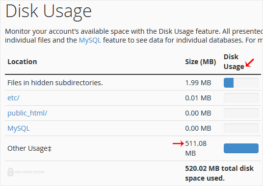 3. From the Disk Space Usage area, you can see which directory is using a lot of space and check the disk usage of MySQL.