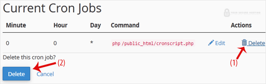 1. Under Current Cron Jobs, locate your cronjob and click on Delete.