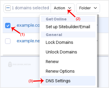 4. Check the box next to your domain name(s) and click on the DNS Settings from the Action menu.