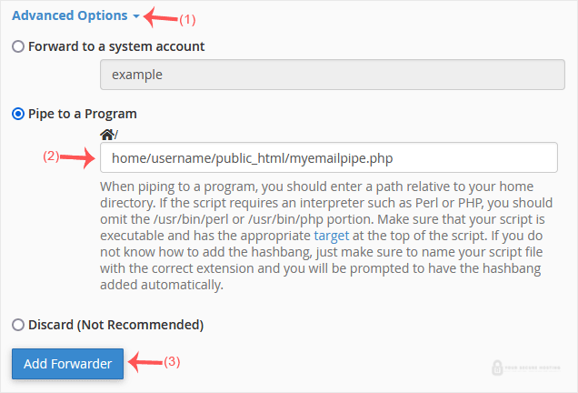 3. In the Destination section, click on Advanced Options, select Pipe to a Program and enter the full path of your pipe script, such as home/username/public_html/myemailpipe.php. You may have noticed that we do not use a slash at the beginning of the URL.