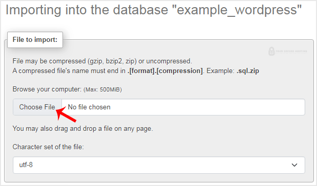 5. Under File to import, click on Choose File and select SQL file from your computer.